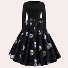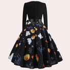 Questo abito vintage a maniche lunghe con stampa a tema Halloween combina stile retrò e atmosfera festosa per un look unico.