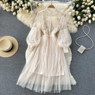 Questo abito vintage in tulle presenta un raffinato corpetto ricamato con dettagli in pizzo, maniche a sbuffo trasparenti e una gonna leggera e fluida. Il design a strati con tessuti delicati aggiunge un tocco romantico e sofisticato, perfetto per occasioni speciali.