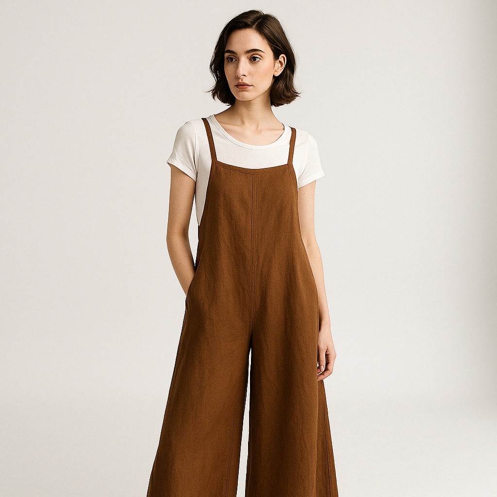 Questa salopette in lino verde è l'emblema dell'eleganza casual. Il tessuto leggero e la vestibilità morbida la rendono ideale per ogni occasione, dalla passeggiata in città ai weekend fuori porta.