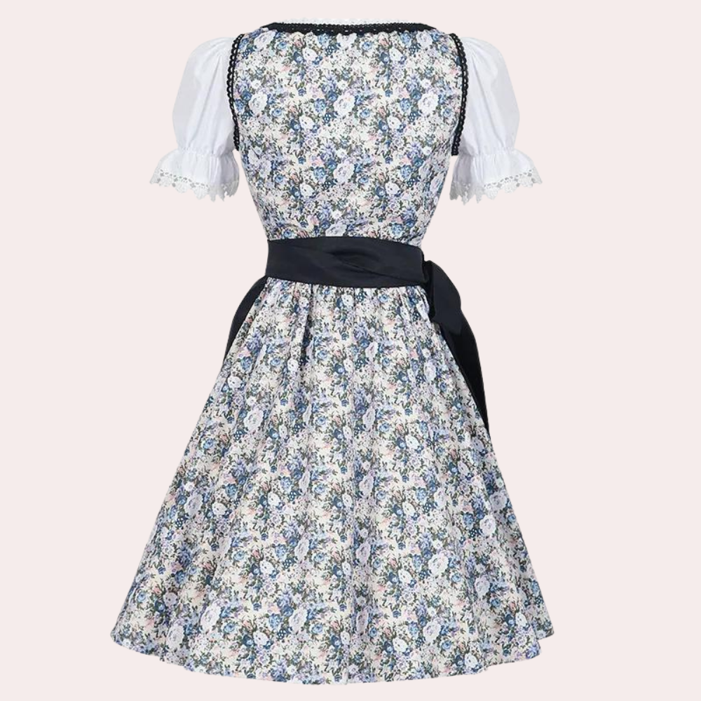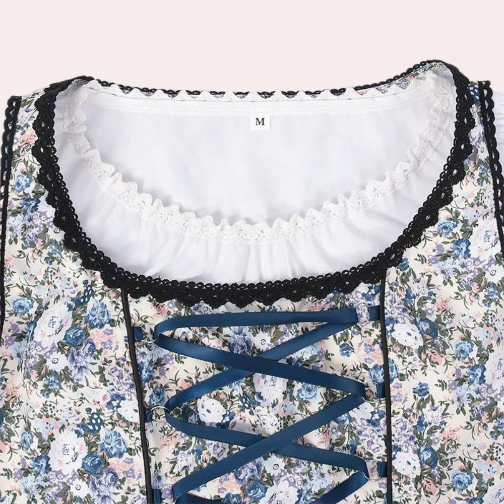 Questo elegante dirndl unisce tradizione e raffinatezza con il suo design floreale e dettagli in pizzo. Il corsetto con intreccio crea una silhouette femminile, mentre il grembiule a contrasto aggiunge un tocco classico. Ideale per feste, celebrazioni e look autentici in stile bavarese.