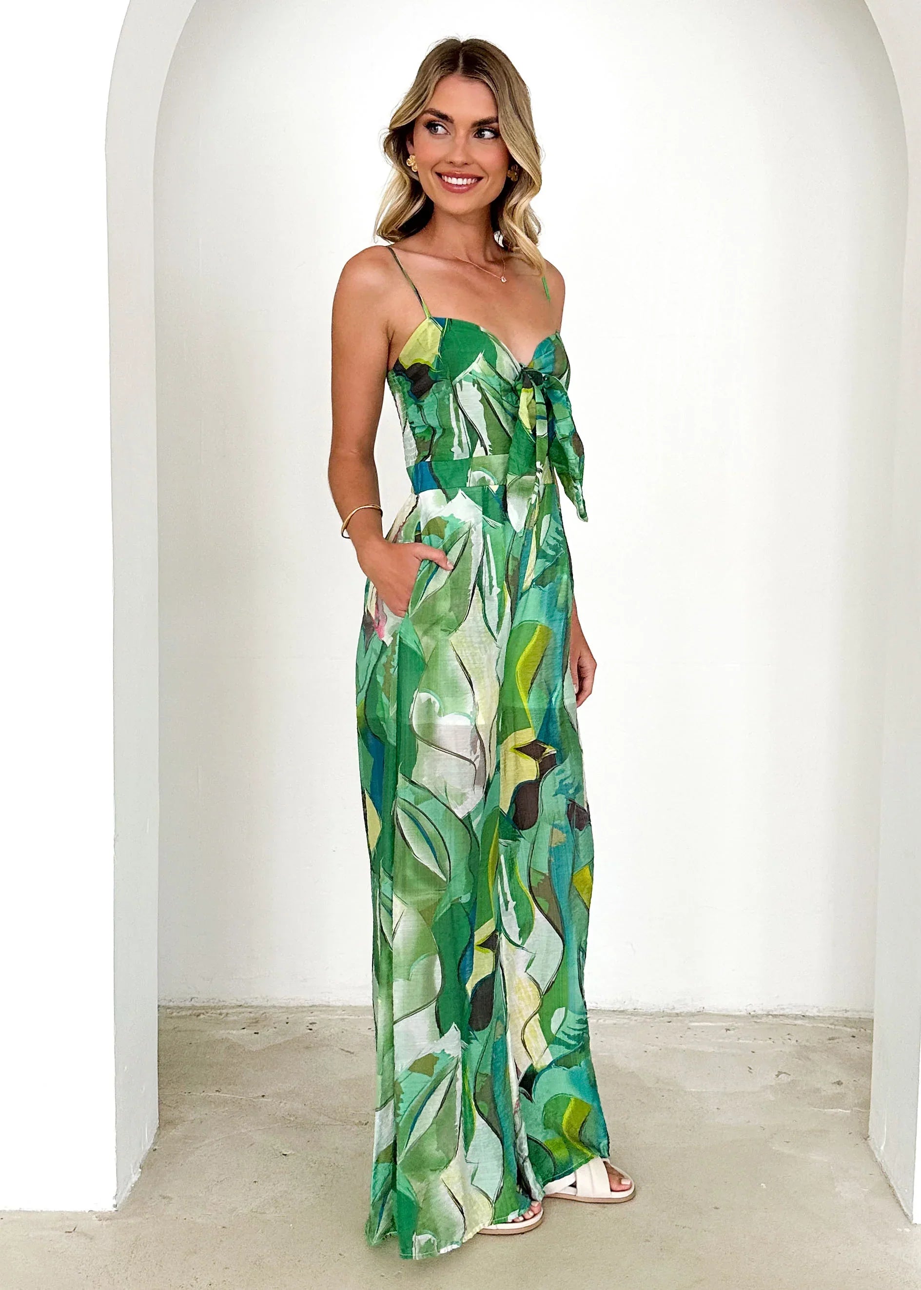 Questa jumpsuit lunga è il capo ideale per chi ama distinguersi con stile e freschezza.