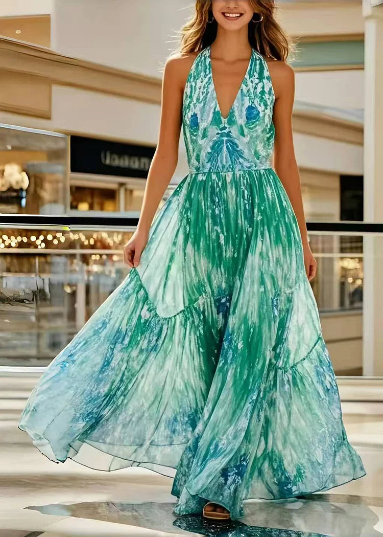 Questo maxi dress dal motivo acquerellato verde e blu è un'esplosione di freschezza e movimento.
