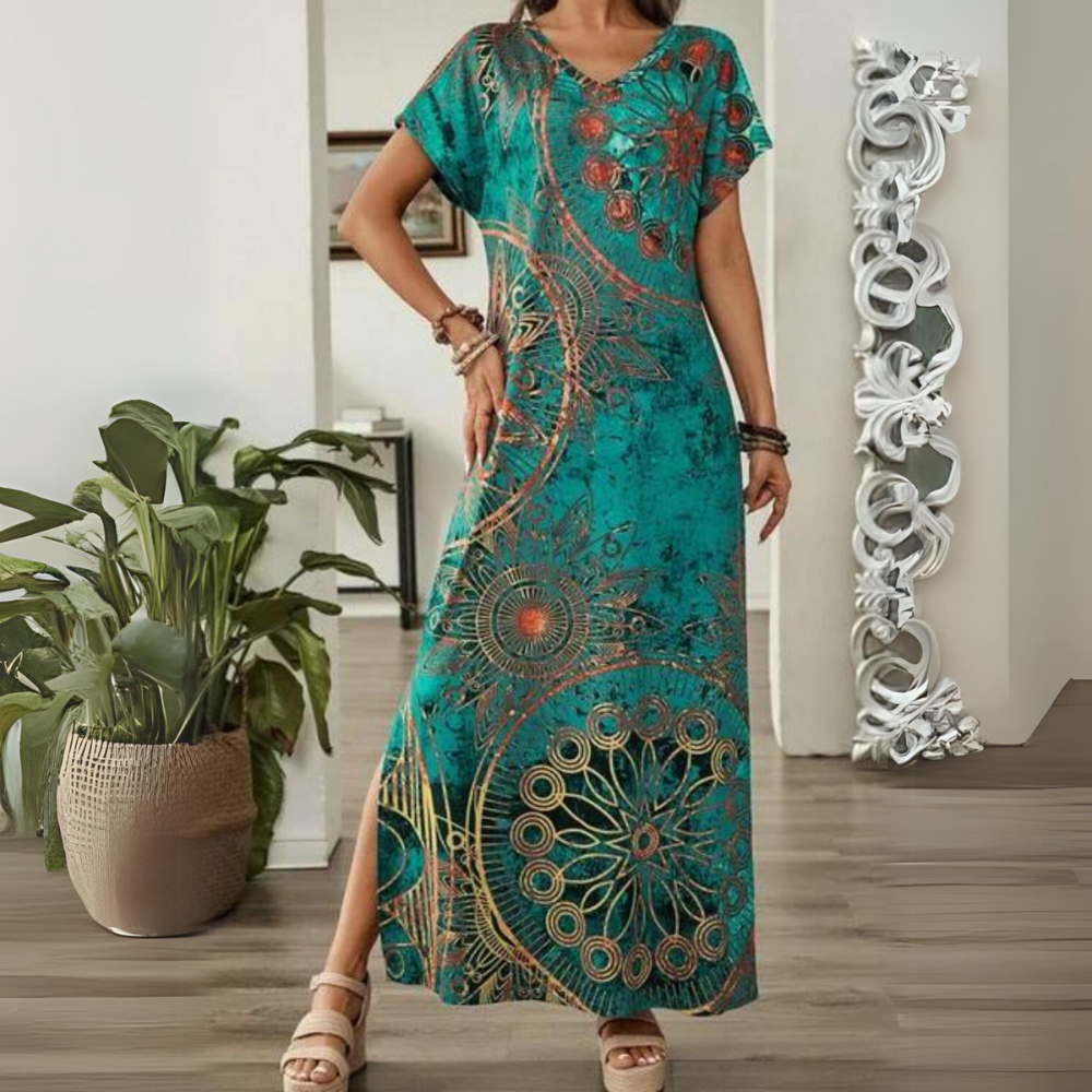 Questo maxi dress con stampa mandala è la scelta ideale per chi ama il comfort senza rinunciare allo stile.
