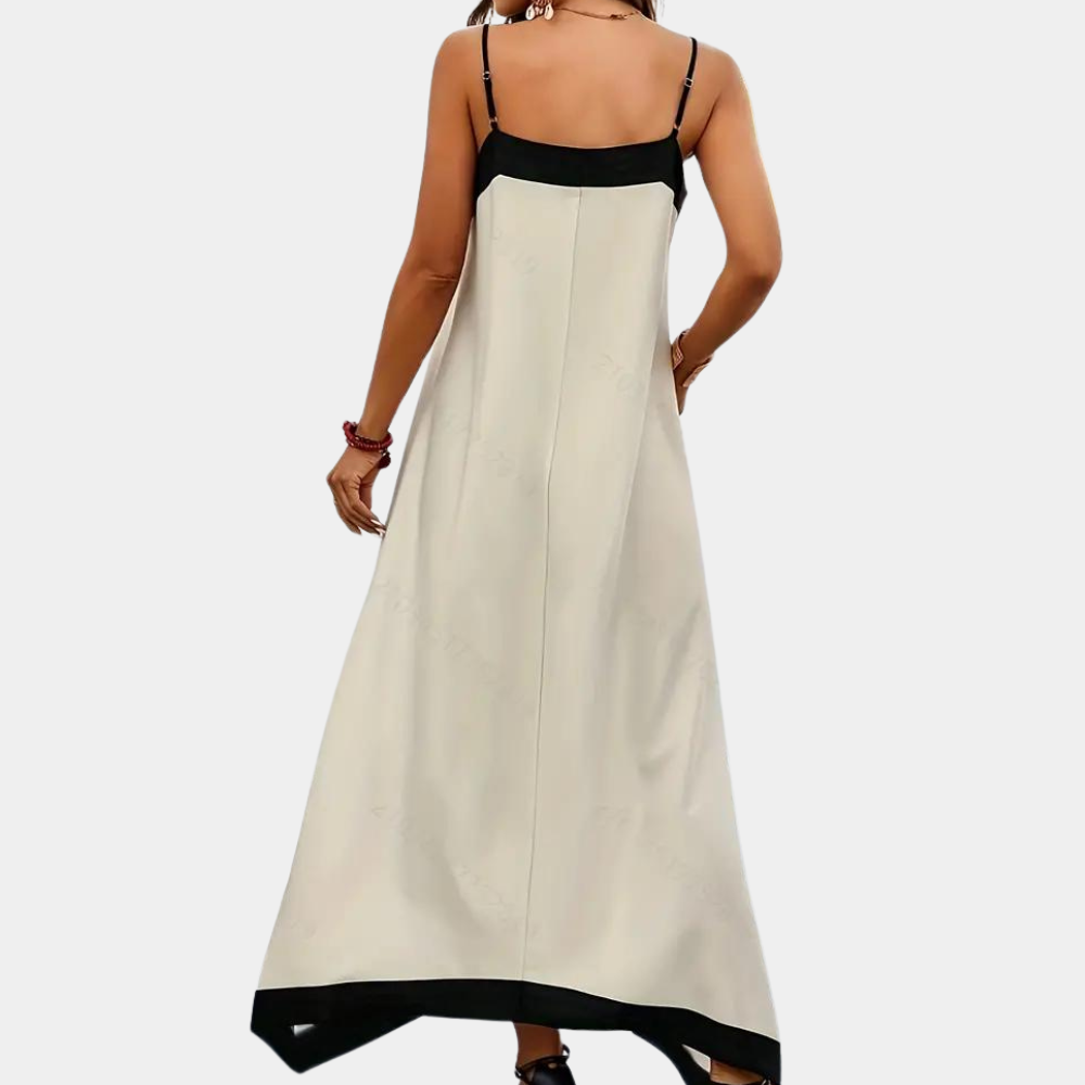 Questo maxi dress senza maniche ha un elegante design con bordo a contrasto, una vestibilità fluida e spalline sottili per un look sofisticato e arioso.