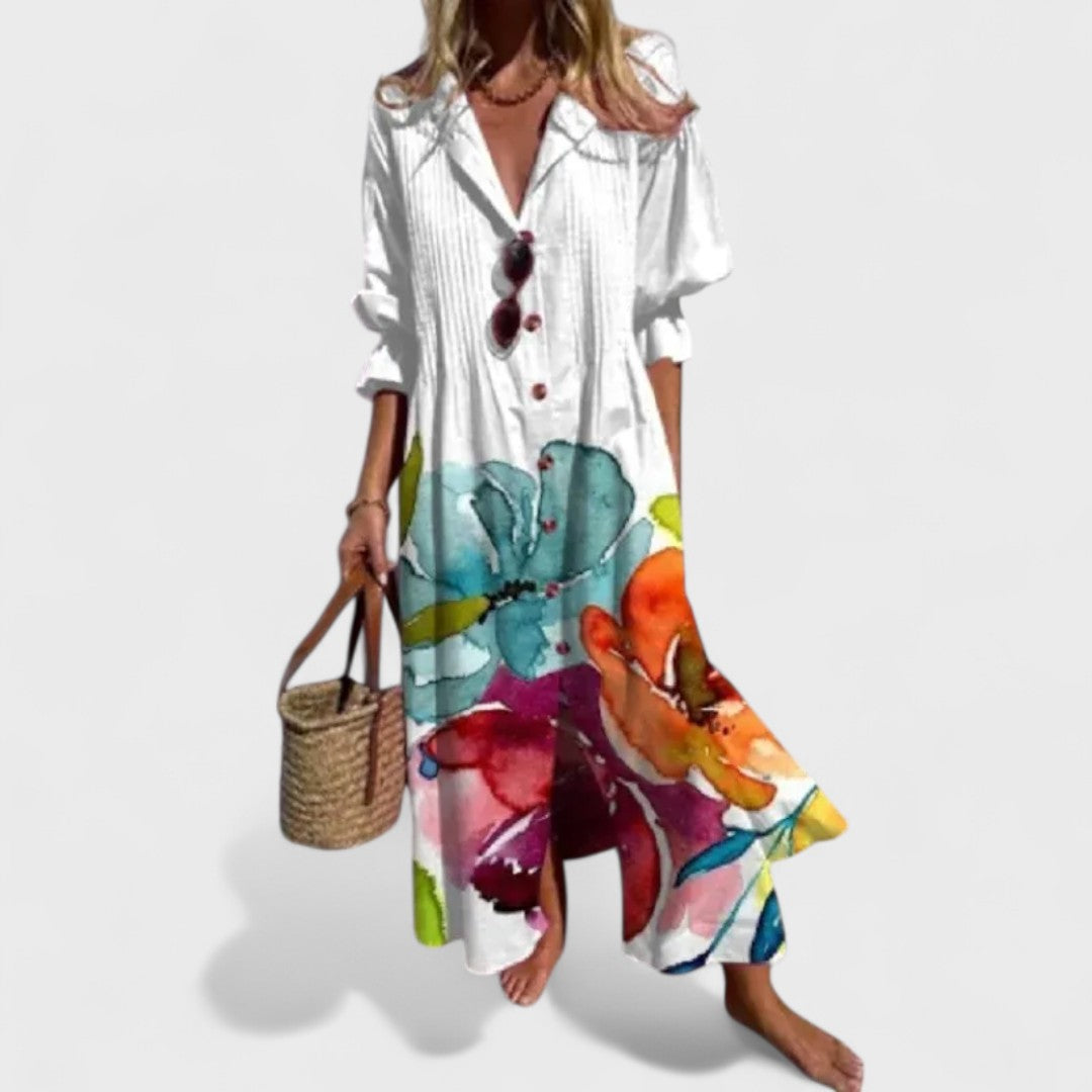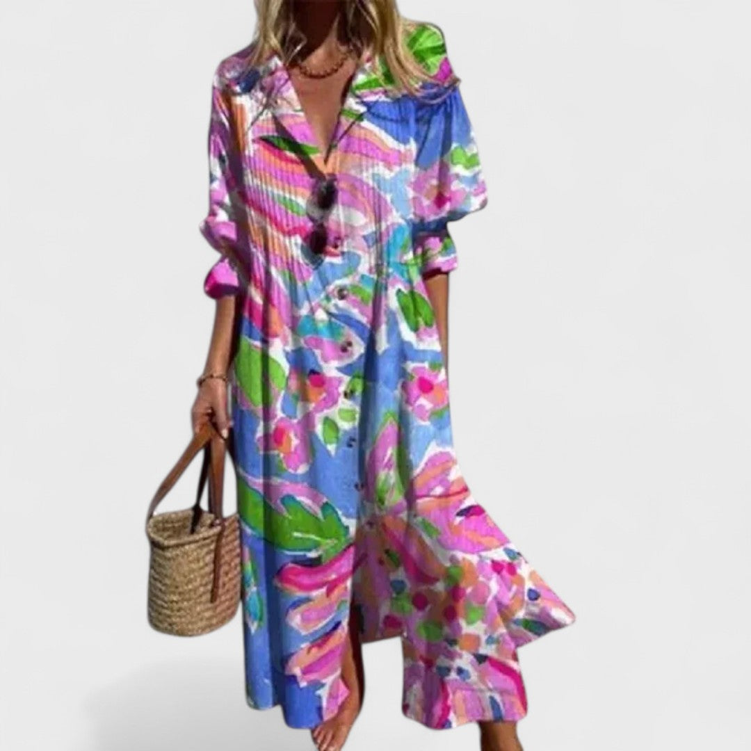 Questo maxi dress con stampa floreale artistica unisce comfort e stile in un capo che cattura l’attenzione.