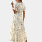 Questo maxi dress floreale presenta un delicato scollo a V, maniche corte e una gonna ampia e fluida per un look femminile e sofisticato.