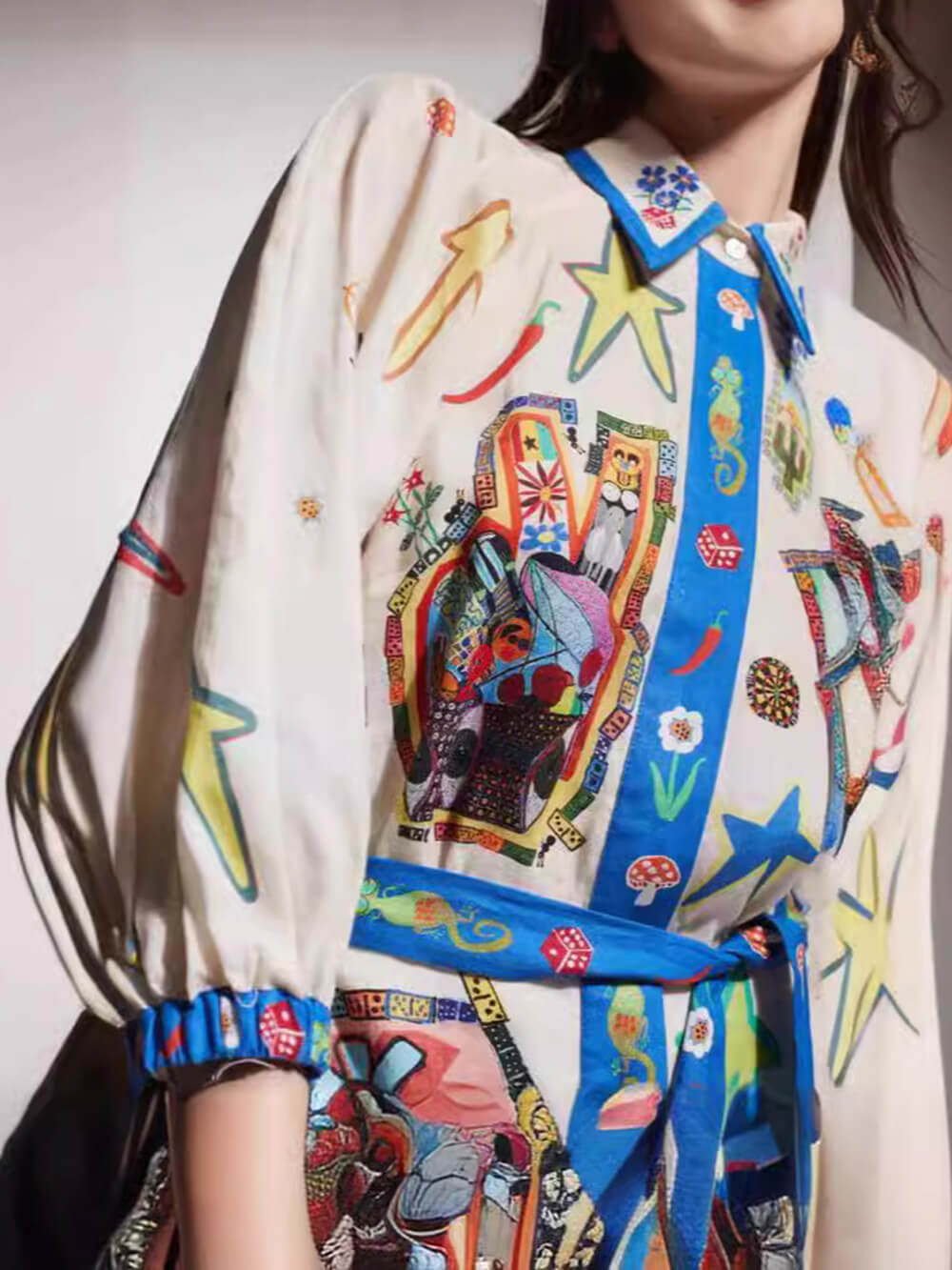 Questo mini abito camicia con stampa ispirata ai motivi folkloristici è la scelta perfetta per chi ama l’originalità. Le maniche a palloncino, il taglio dritto e la cintura blu che segna la vita creano un equilibrio tra struttura e femminilità. Perfetto per un outfit da giorno raffinato ma d’impatto.