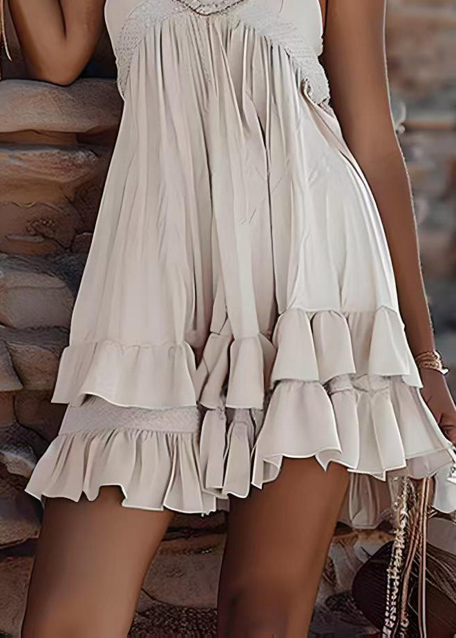 Questo mini abito con balze e spalline sottili è perfetto per esaltare la tua femminilità con un tocco boho chic.