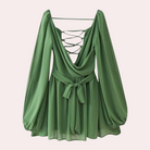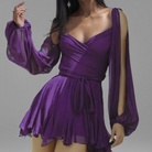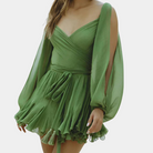 Questo mini abito in stile principessa con maniche lunghe a sbuffo è perfetto per un look sofisticato e femminile. Il corpetto aderente con scollo a cuore valorizza la figura, mentre la gonna svasata con balze dona un tocco elegante e seducente. Ideale per eventi speciali, serate glamour o feste.