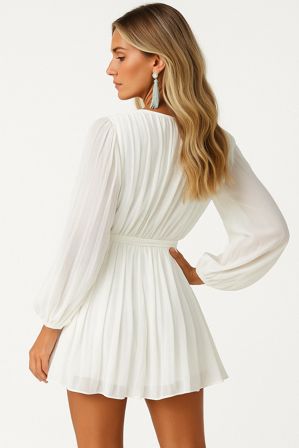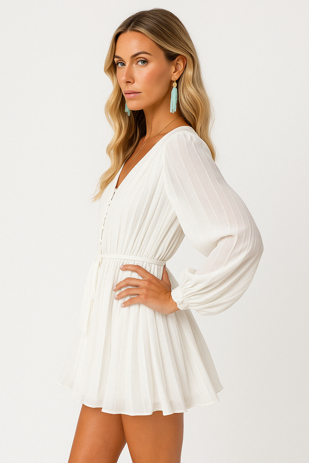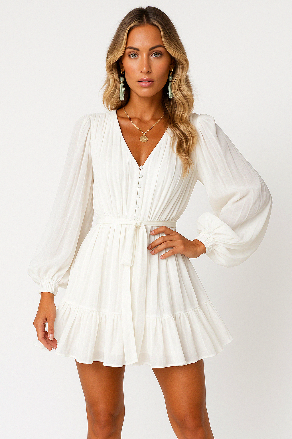 Questo romper a maniche lunghe con scollo a V e cintura in vita è ideale per un outfit boho-chic. Il tessuto leggero e la vestibilità fluida offrono comfort e stile, perfetto per giornate soleggiate e serate rilassate.
