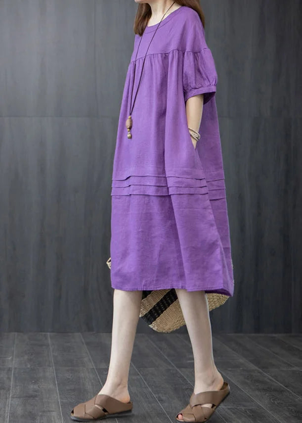 Questo vestito corto in lino viola è perfetto per uno stile casual e naturale, senza rinunciare al comfort.