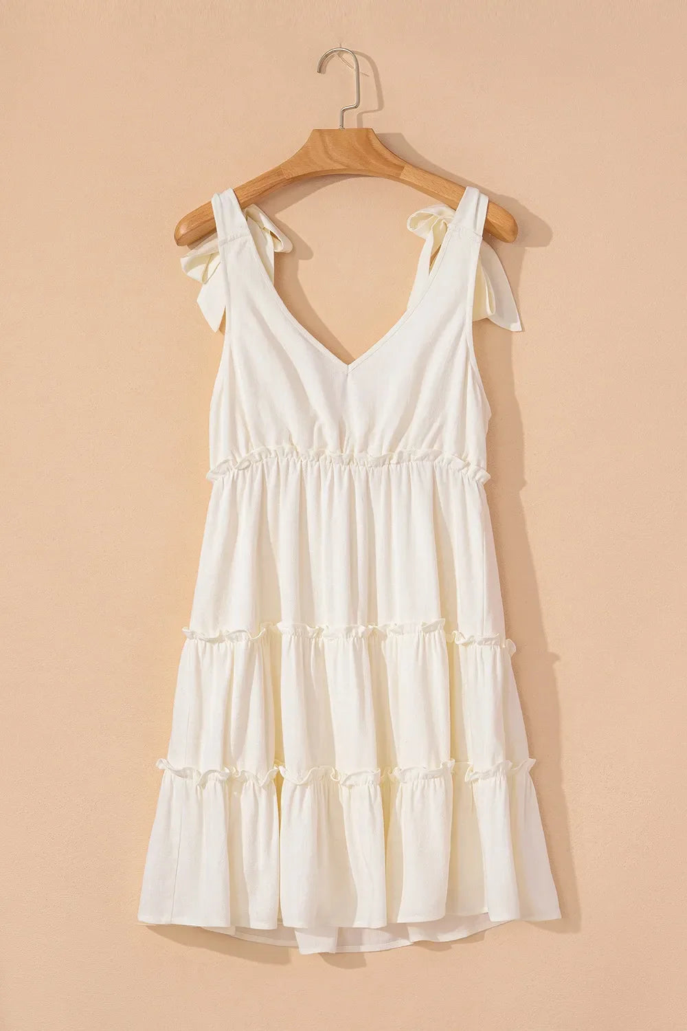 Questo vestito bianco con spalline annodate e balze romantiche è l’emblema della freschezza e dello stile disinvolto.