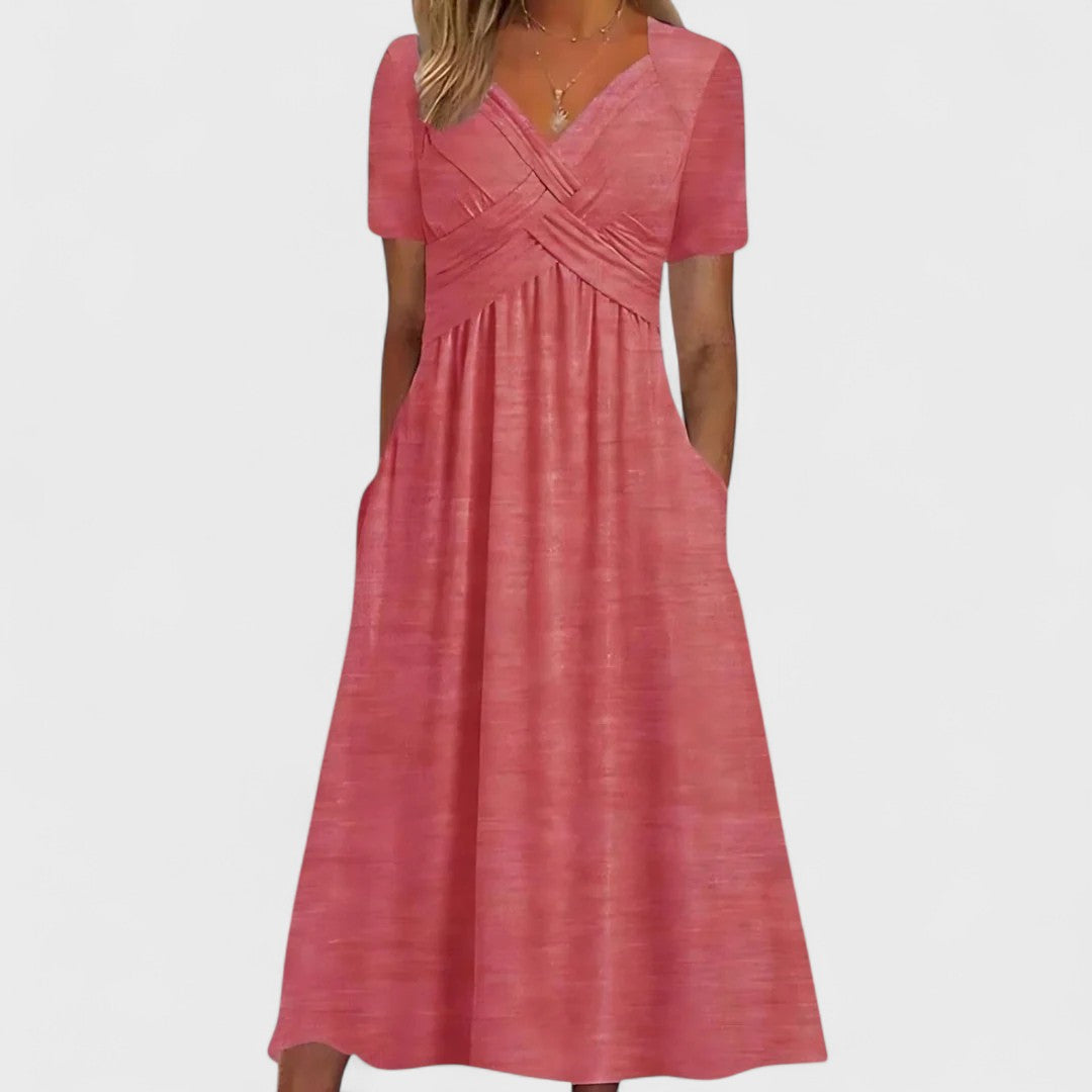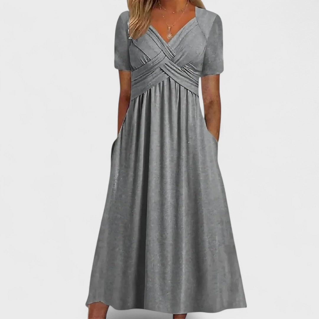 Questo abito lungo con scollo incrociato valorizza la silhouette con semplicità e grazia.