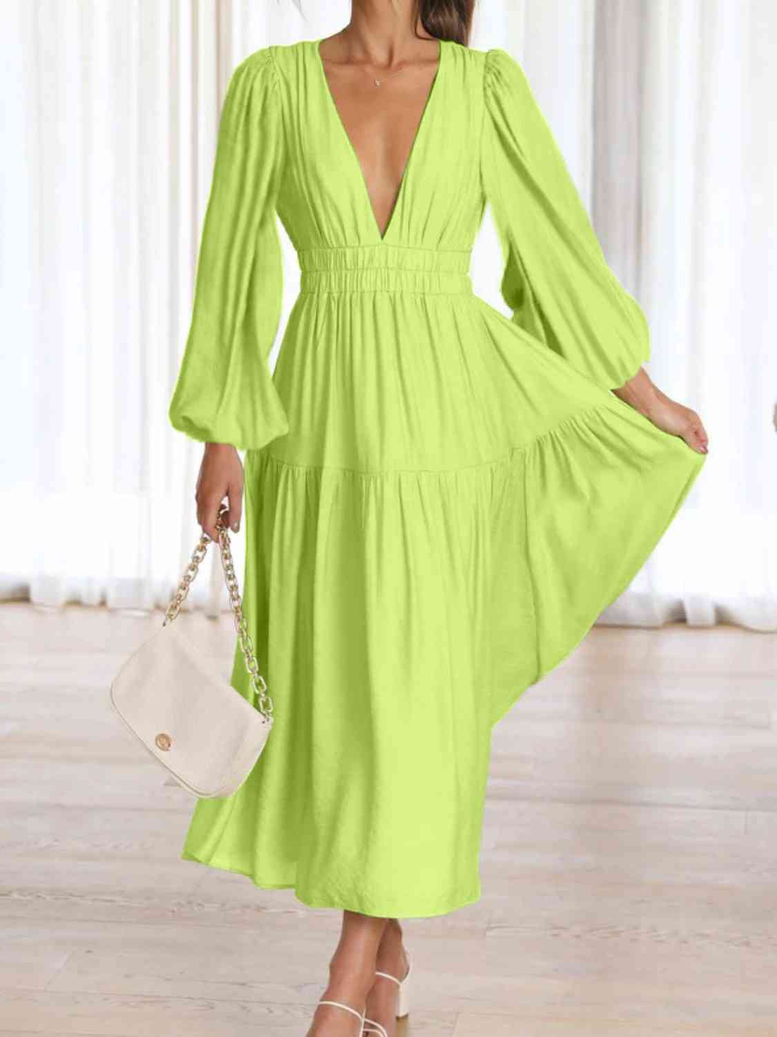 Questo vestito lungo con scollo a V profondo e maniche a palloncino è la scelta ideale per un look femminile e sofisticato.