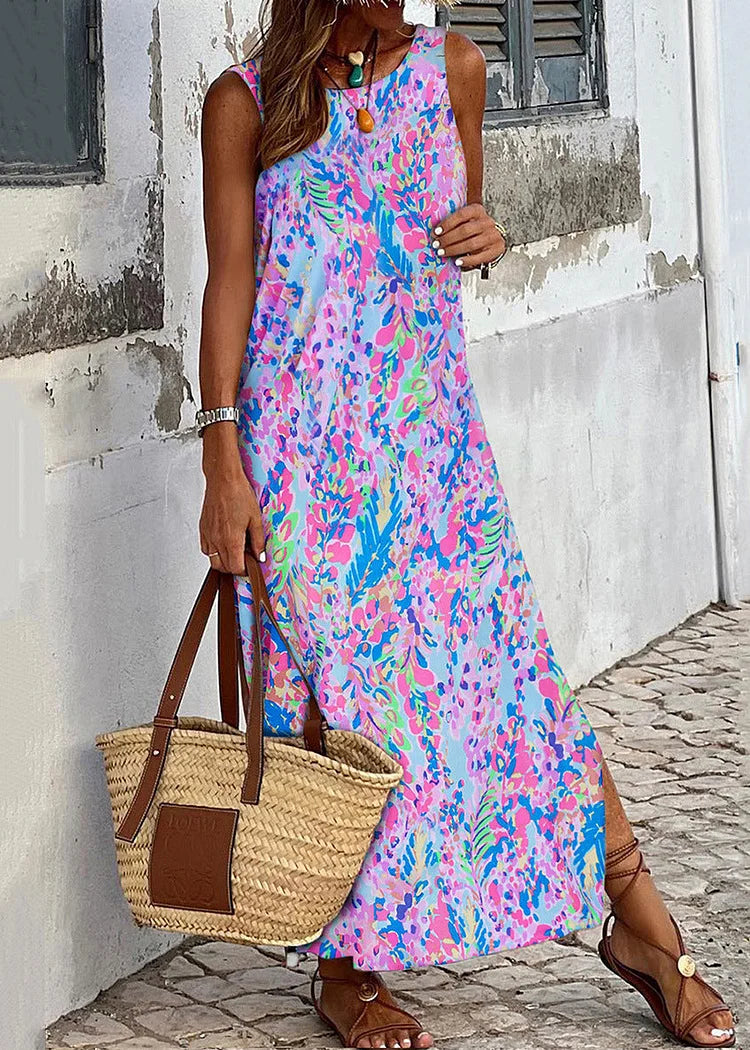 Questo vestito lungo senza maniche è la scelta perfetta per un look vivace e spensierato sotto il sole.