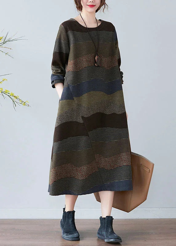 Questo vestito midi a maniche lunghe con fantasia a righe irregolari è ideale per un look casual ma ricercato.