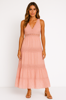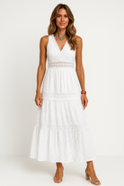 Il corpetto lavorato e la vita segnata donano una silhouette armoniosa, ideale per cerimonie, vacanze o giornate di sole.
