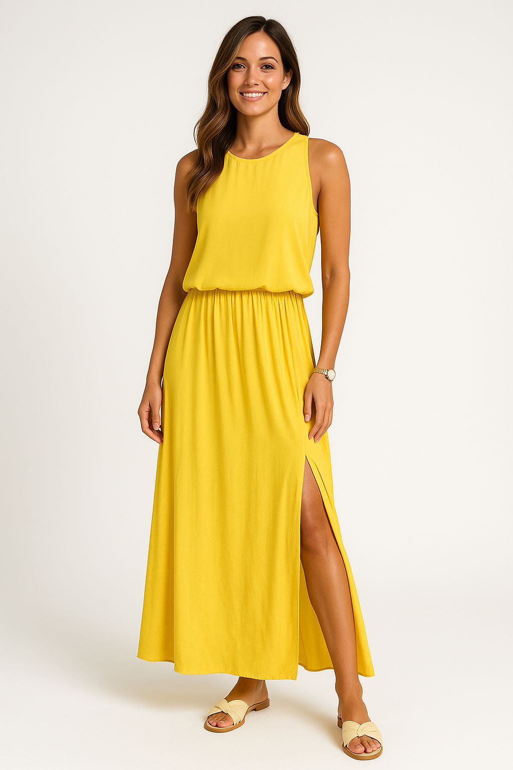 Il vestito lungo Thalea è un modello senza tempo, con scollo tondo, spalline larghe e un taglio morbido che valorizza ogni silhouette.