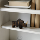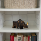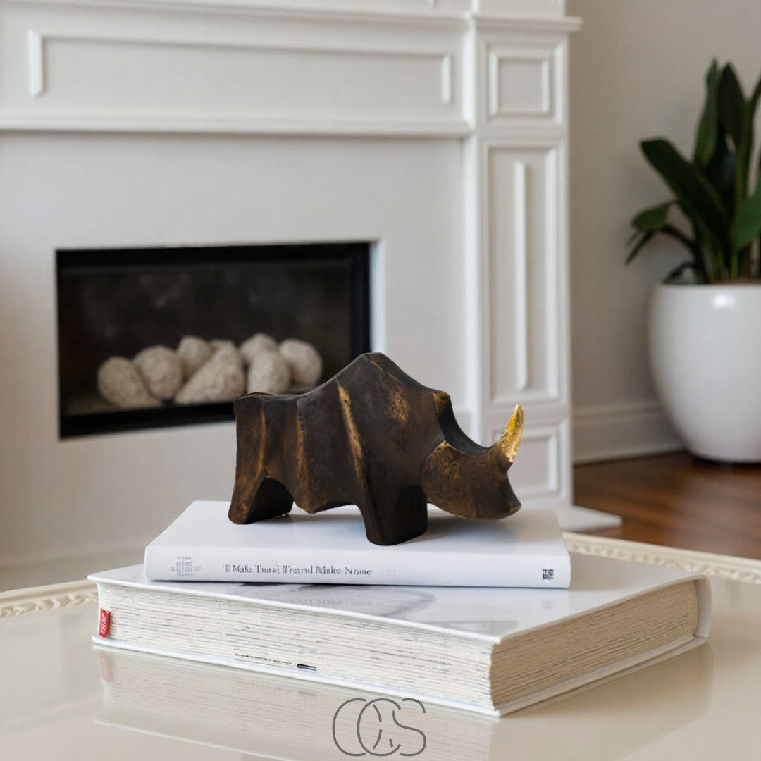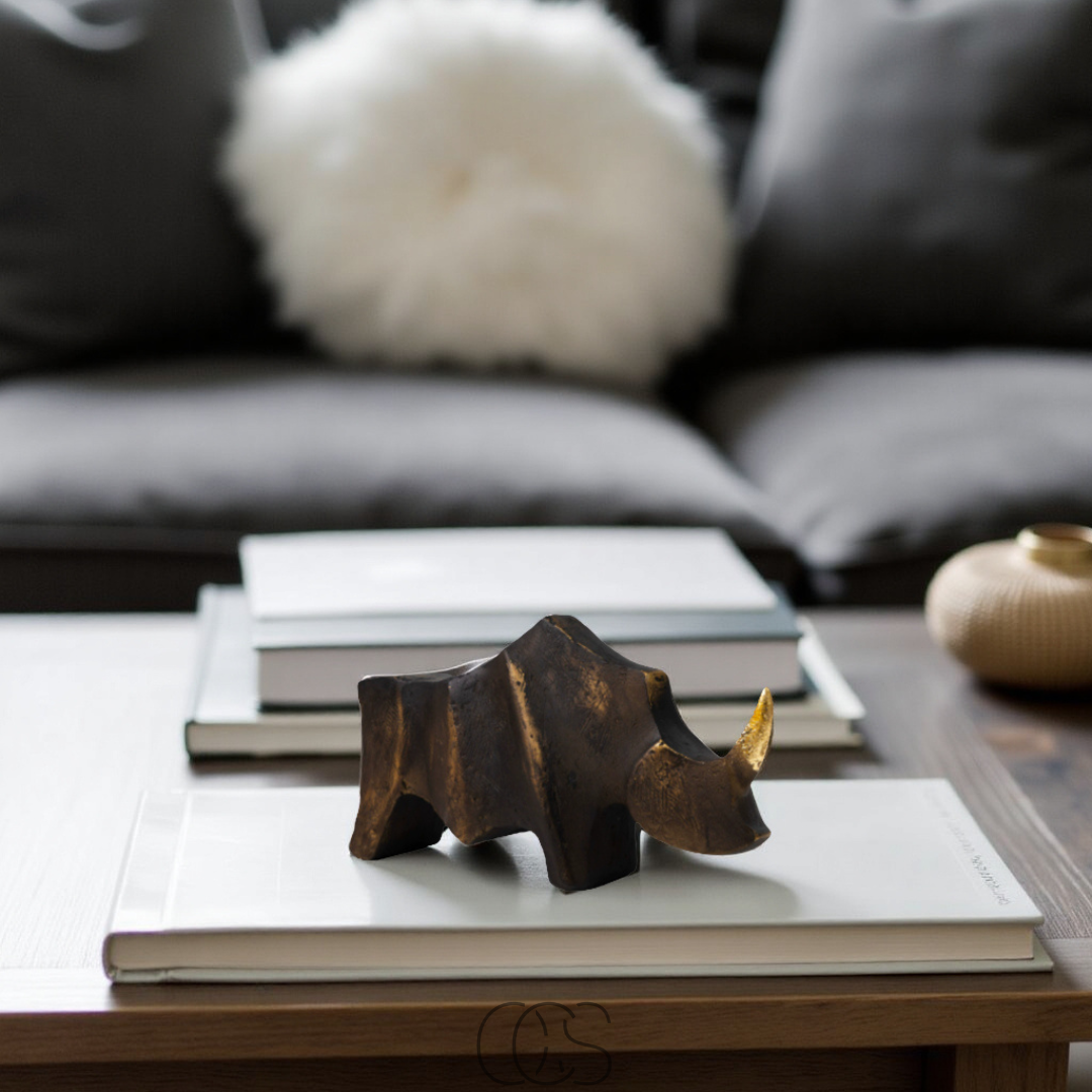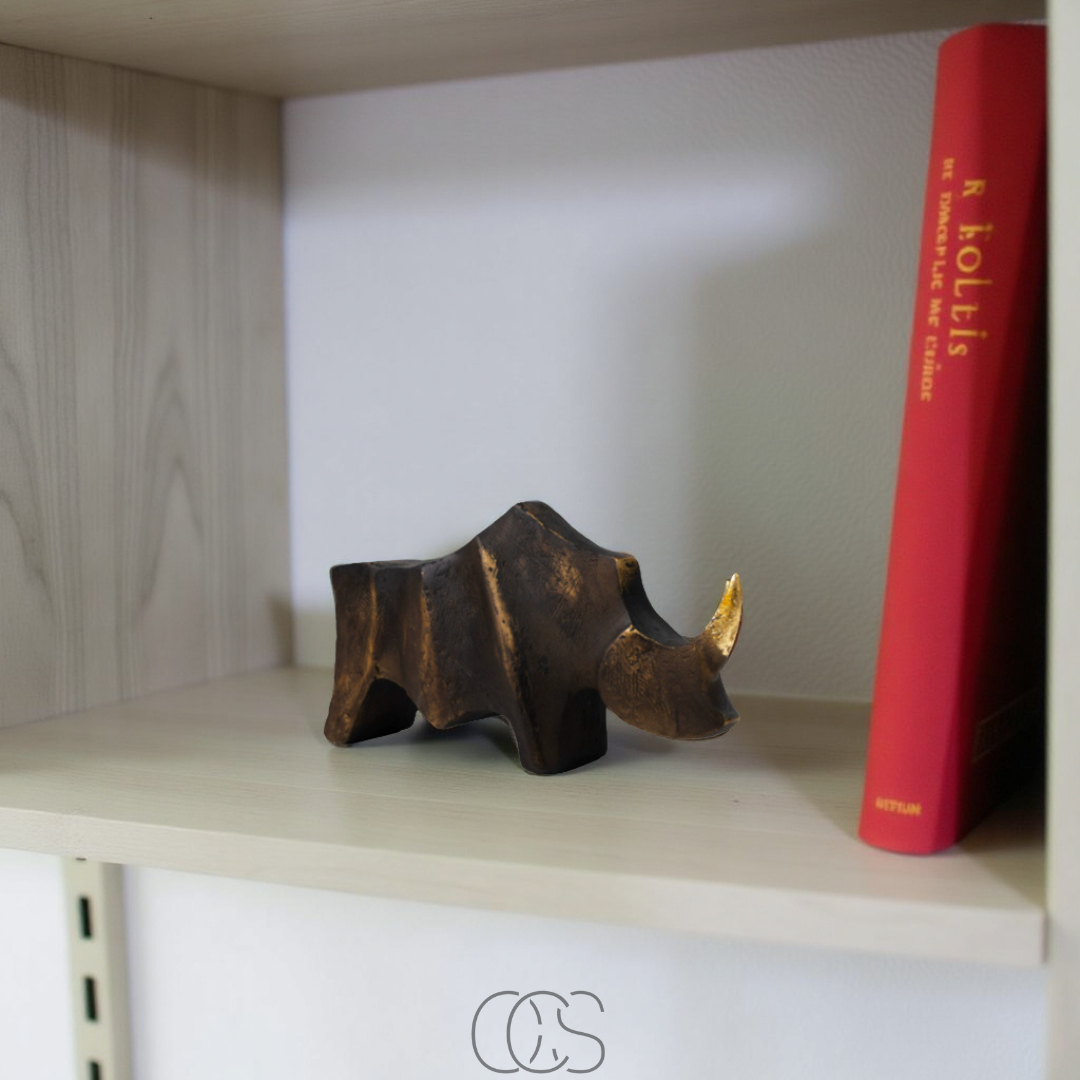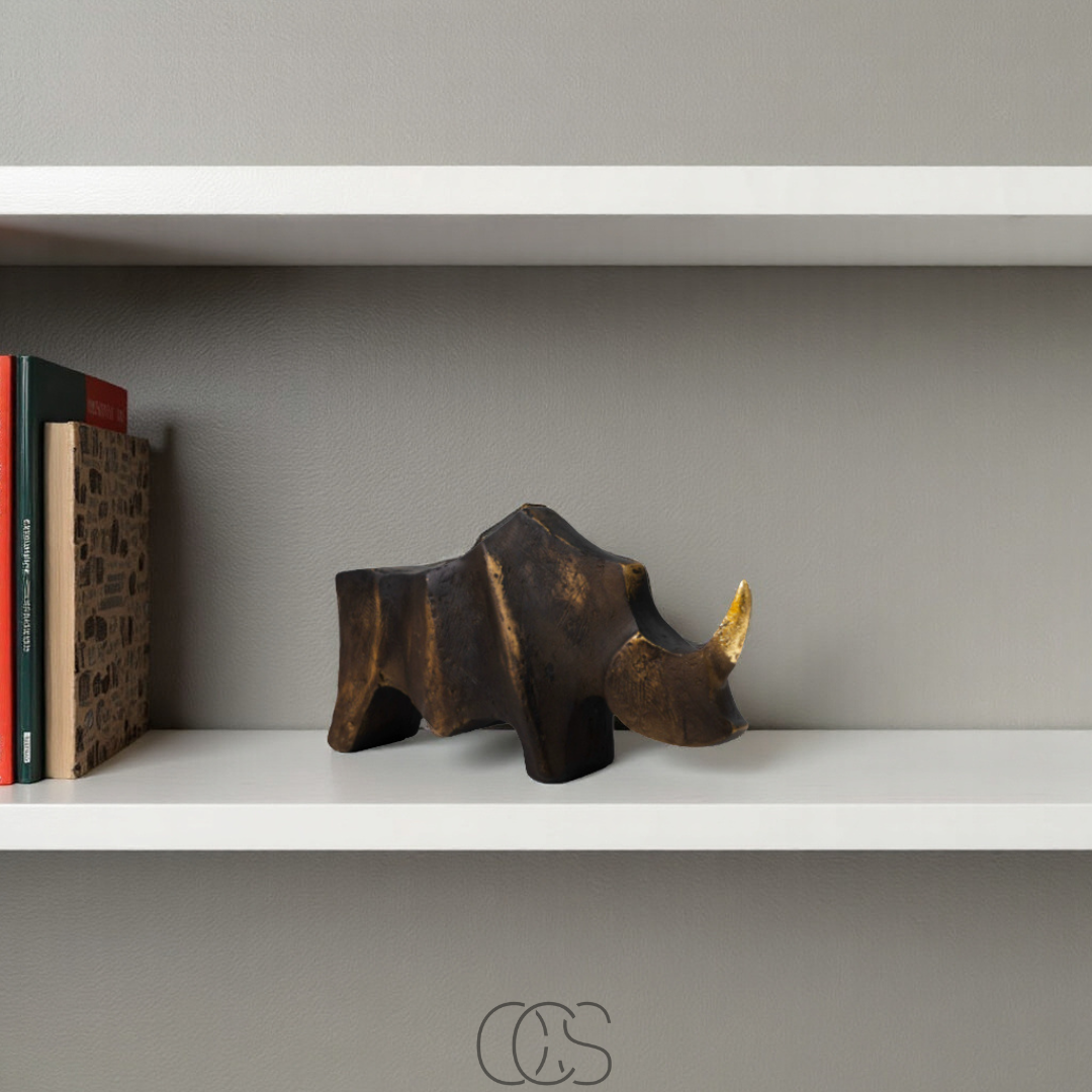 Questa scultura di rinoceronte stilizzato, con finitura antica e corno dorato, è l’ideale per arricchire librerie, tavolini o mensole con un tocco deciso.