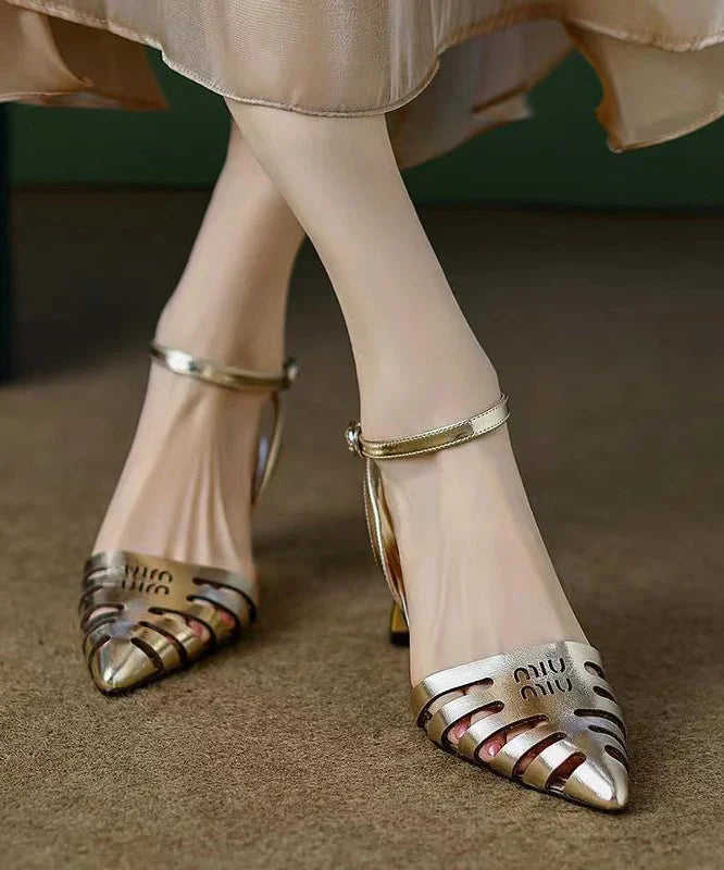 Queste décolleté dorate con cinturino alla caviglia e punta traforata sono il connubio perfetto tra classe e originalità.