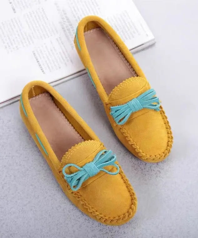 Questi mocassini in stile casual con fiocco azzurro e base gialla sono l’ideale per chi ama osare con stile.