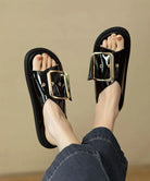 Questi sandali neri con maxi fibbia dorata uniscono comfort e un design elegante e moderno.