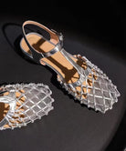 Questi sandali con design a rete dorata aggiungono un tocco glamour al tuo look, mantenendo leggerezza e originalità.