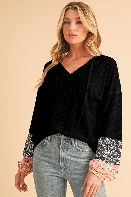 Questa blusa con maniche fantasia a contrasto è perfetta per aggiungere un tocco bohémien ai tuoi look casual.