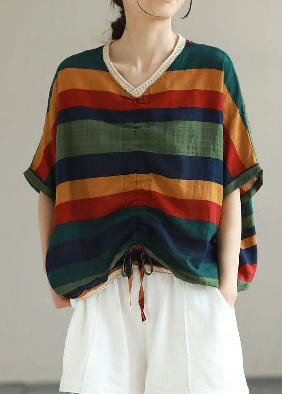 Questa blusa a righe multicolore con scollo a V e coulisse sul fondo è perfetta per un look casual e vivace.
