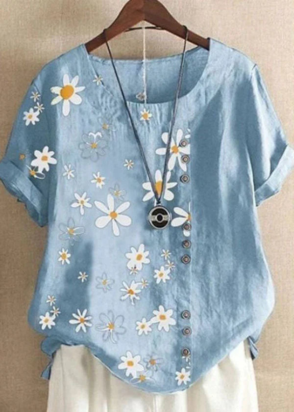 Questa camicetta in cotone con stampa a margherite è allegra, leggera e ideale per un outfit casual e spensierato.