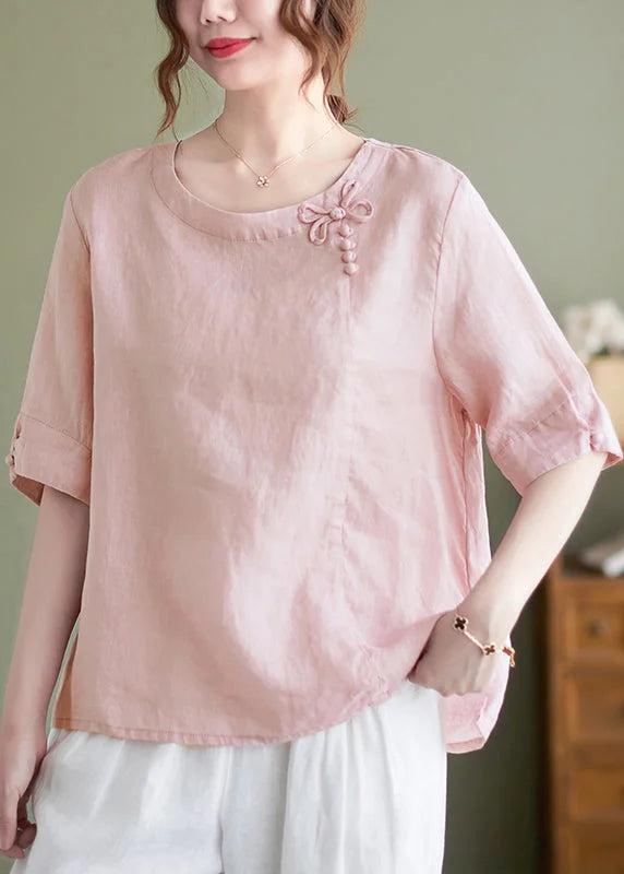 Questa blusa in lino rosa con fiocco decorativo è perfetta per chi desidera eleganza e comfort in un solo capo.