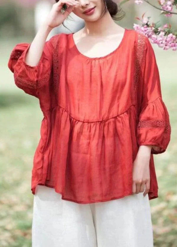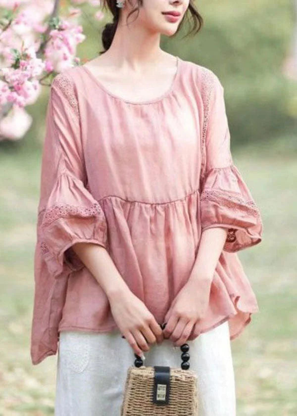 Questa blusa in lino rosa antico con maniche a balze e inserti in pizzo è perfetta per un look delicato e femminile.