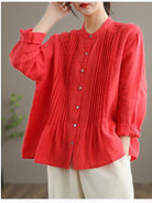 Blusa in Lino con Pieghe e Collo alla Coreana