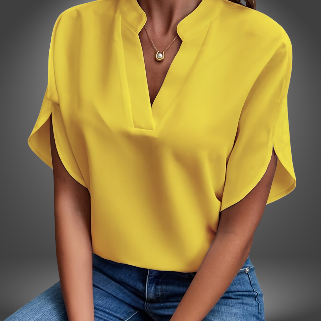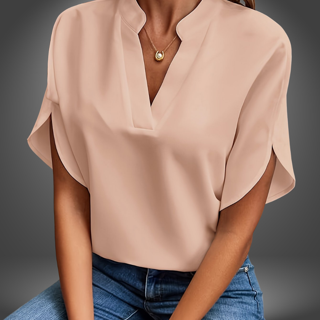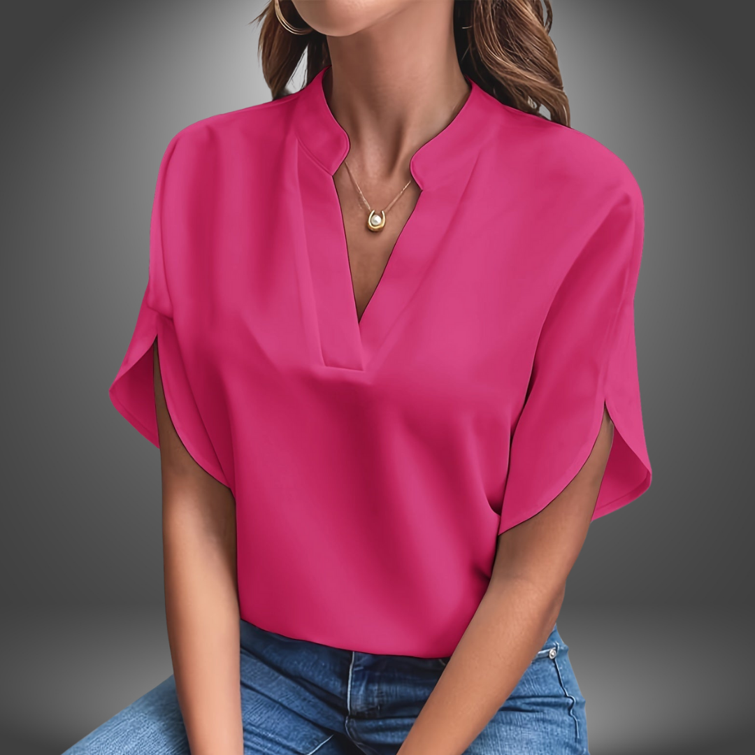 Questa blusa in stile minimal con scollo a V dona un tocco sofisticato al tuo look quotidiano.