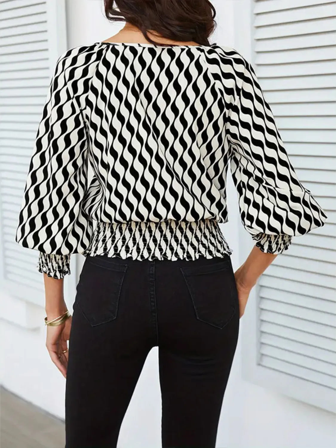 Questa blusa a stampa optical bianca e nera con maniche a palloncino è perfetta per un look elegante e contemporaneo.