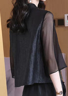 Questa blusa nera ispirata all'estetica orientale combina tessuti leggeri e dettagli ricamati con grande delicatezza.