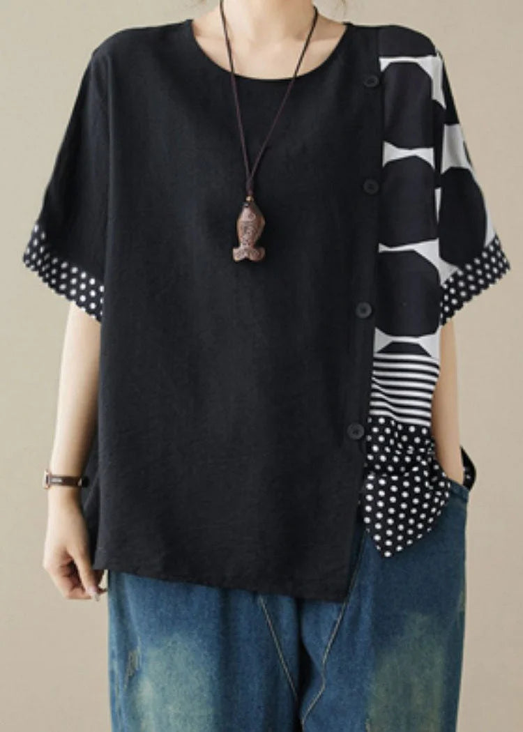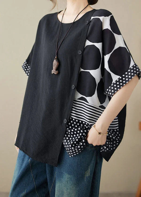 Questa blusa oversize in cotone con dettagli a contrasto e bottoni laterali unisce comfort e stile creativo.