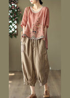 Questa blusa in lino con ricami floreali e colletto a contrasto è un vero omaggio alla bellezza naturale e all’artigianalità.