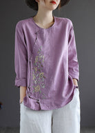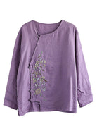 Questa camicia in misto lino con maniche lunghe presenta un ricamo floreale delicato e bottoni laterali decorativi d’ispirazione orientale.
