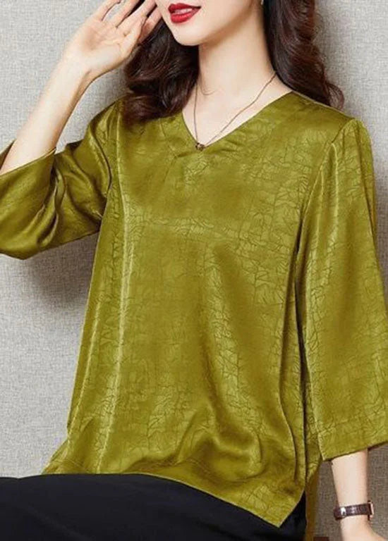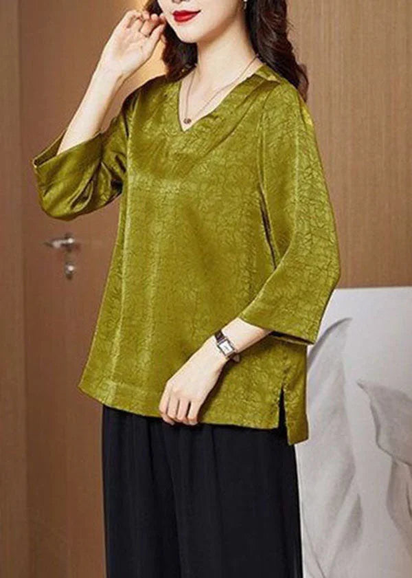 Questa blusa in tessuto satinato con scollo a V e maniche a tre quarti è perfetta per aggiungere un tocco di classe ai tuoi outfit quotidiani.