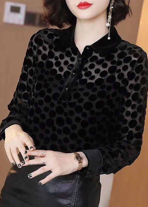 Questa camicetta a pois in velluto trasparente unisce eleganza e modernità, perfetta per aggiungere un tocco sofisticato al tuo guardaroba.