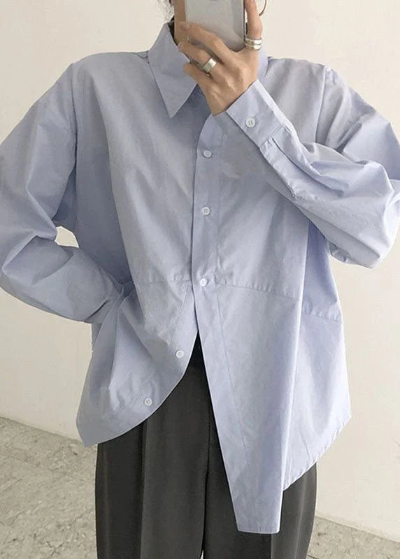 Questa camicia asimmetrica azzurra è perfetta per chi ama lo stile pulito con un tocco di design.