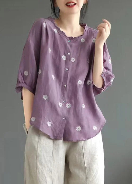 Questa camicia lilla in cotone con piccoli fiori ricamati unisce romanticismo e semplicità in un capo fresco e versatile.