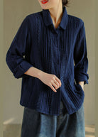 Questa camicia blu navy con dettagli plissé e inserti in pizzo è la perfetta combinazione di stile rilassato e raffinatezza.