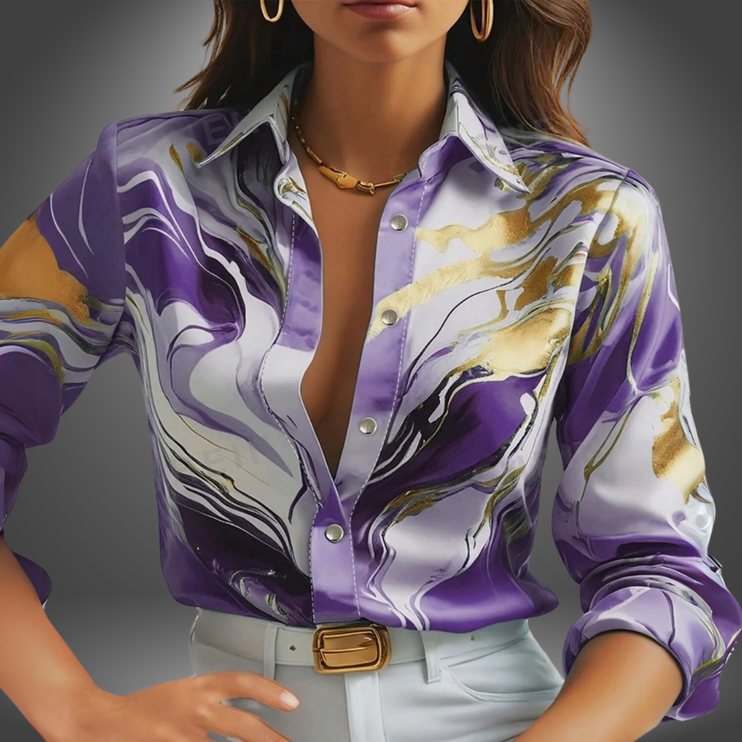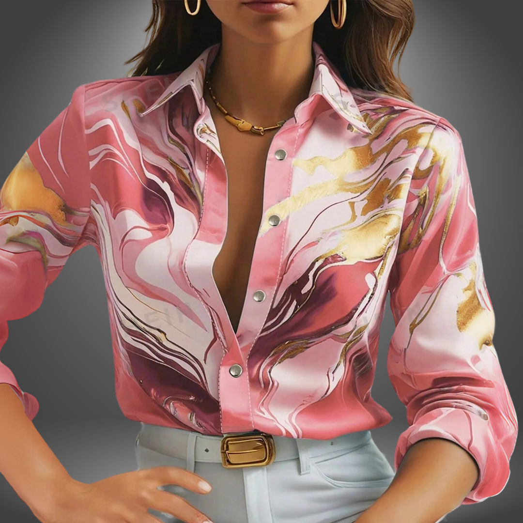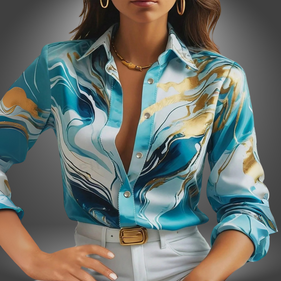 Questa camicia satinata con stampa astratta dona subito un tocco di glamour e personalità.