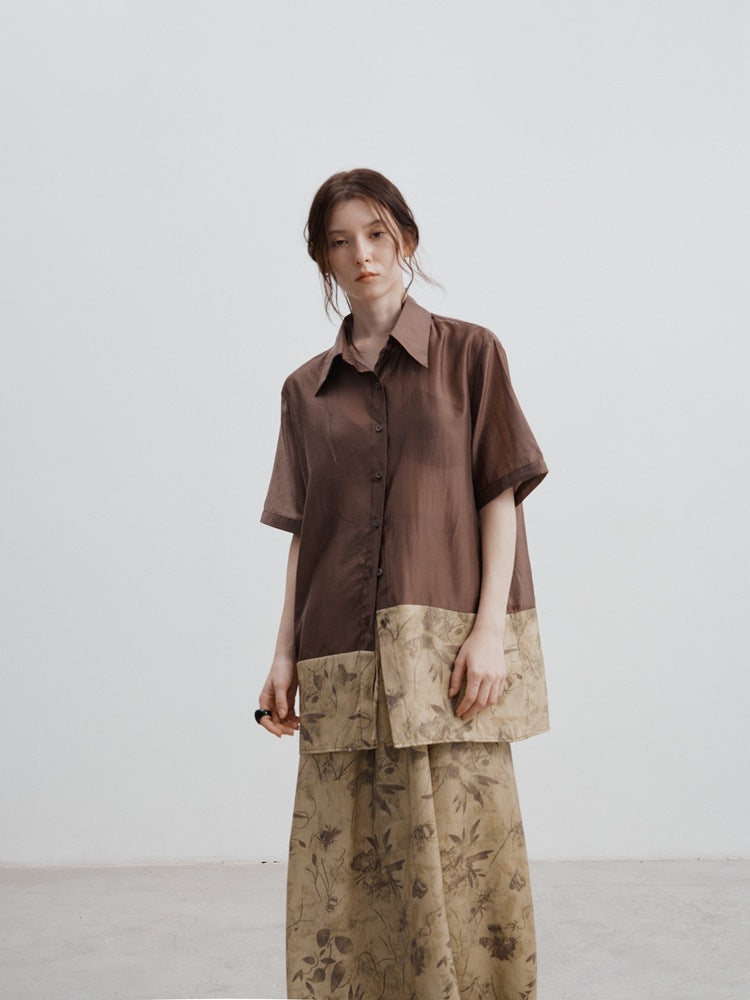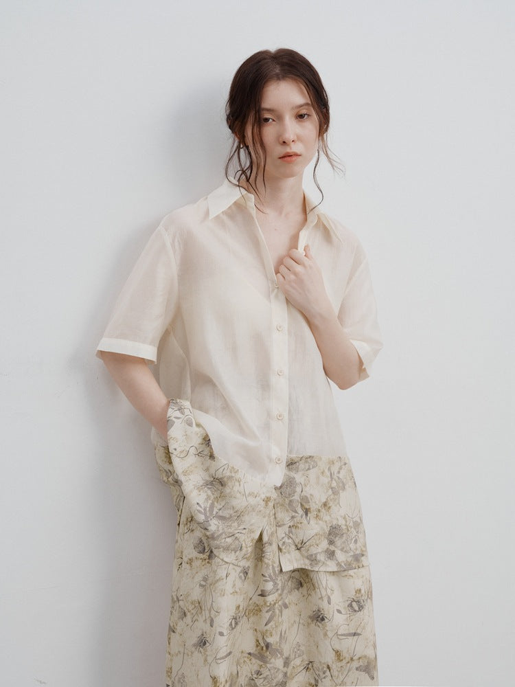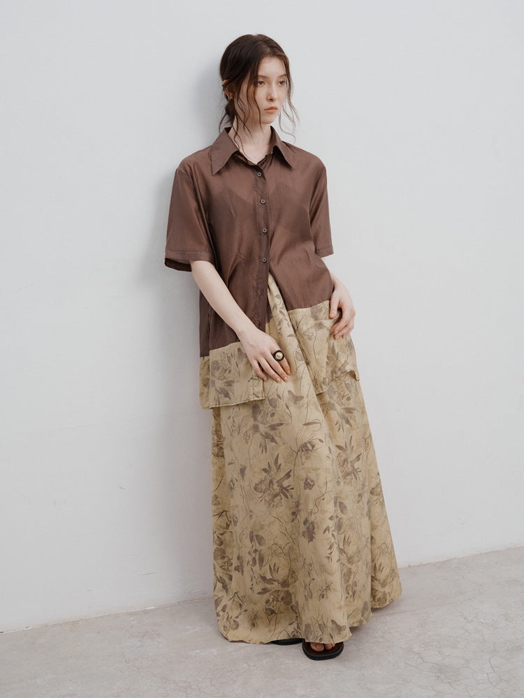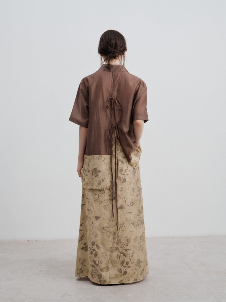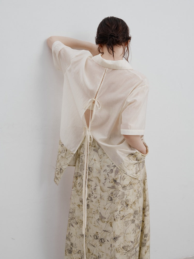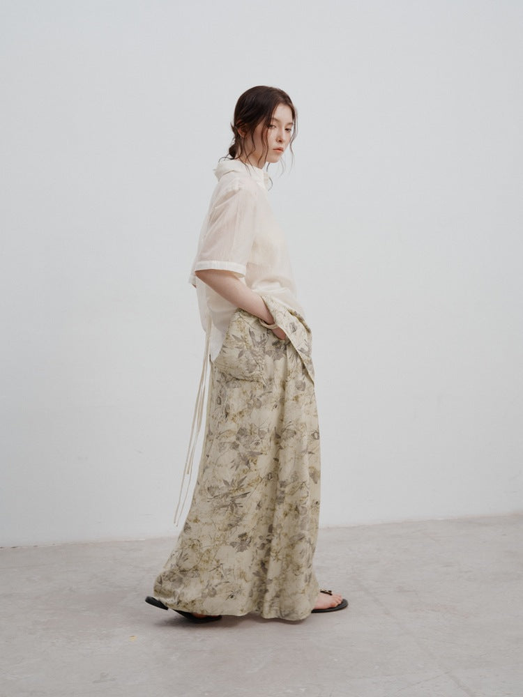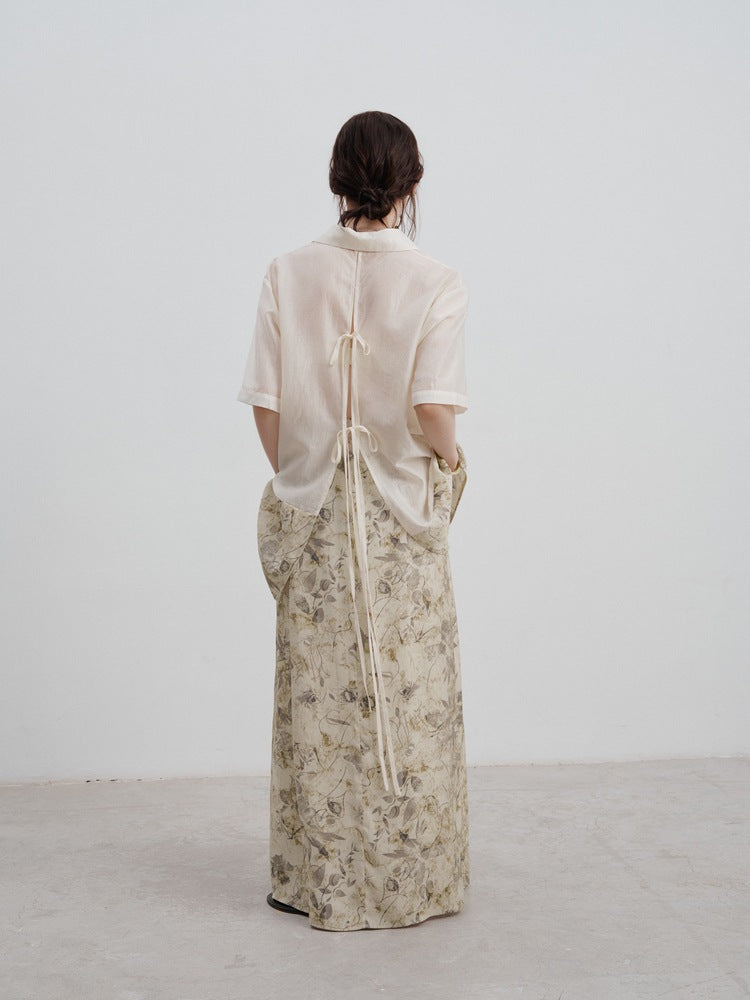 Questo outfit è composto da una camicia in voile semitrasparente con design aperto sul retro e laccio annodabile, abbinata a una gonna lunga a stampa floreale su base neutra. La camicia è disponibile anche in versione cioccolato per un’alternativa più intensa, mentre la gonna aggiunge un tocco romantico ispirato alla natura. Il taglio relaxed dona libertà di movimento e un’aria eterea a ogni passo.