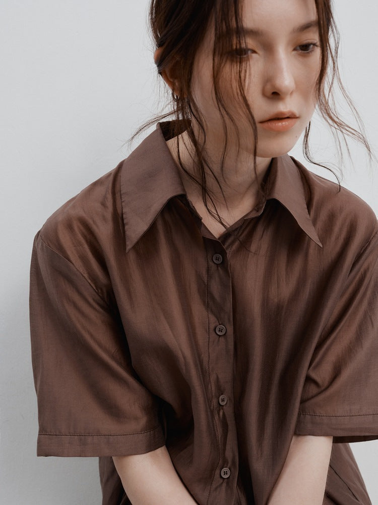 Dettaglio camicia: Retro aperto con chiusura a nastro, maniche corte fluide