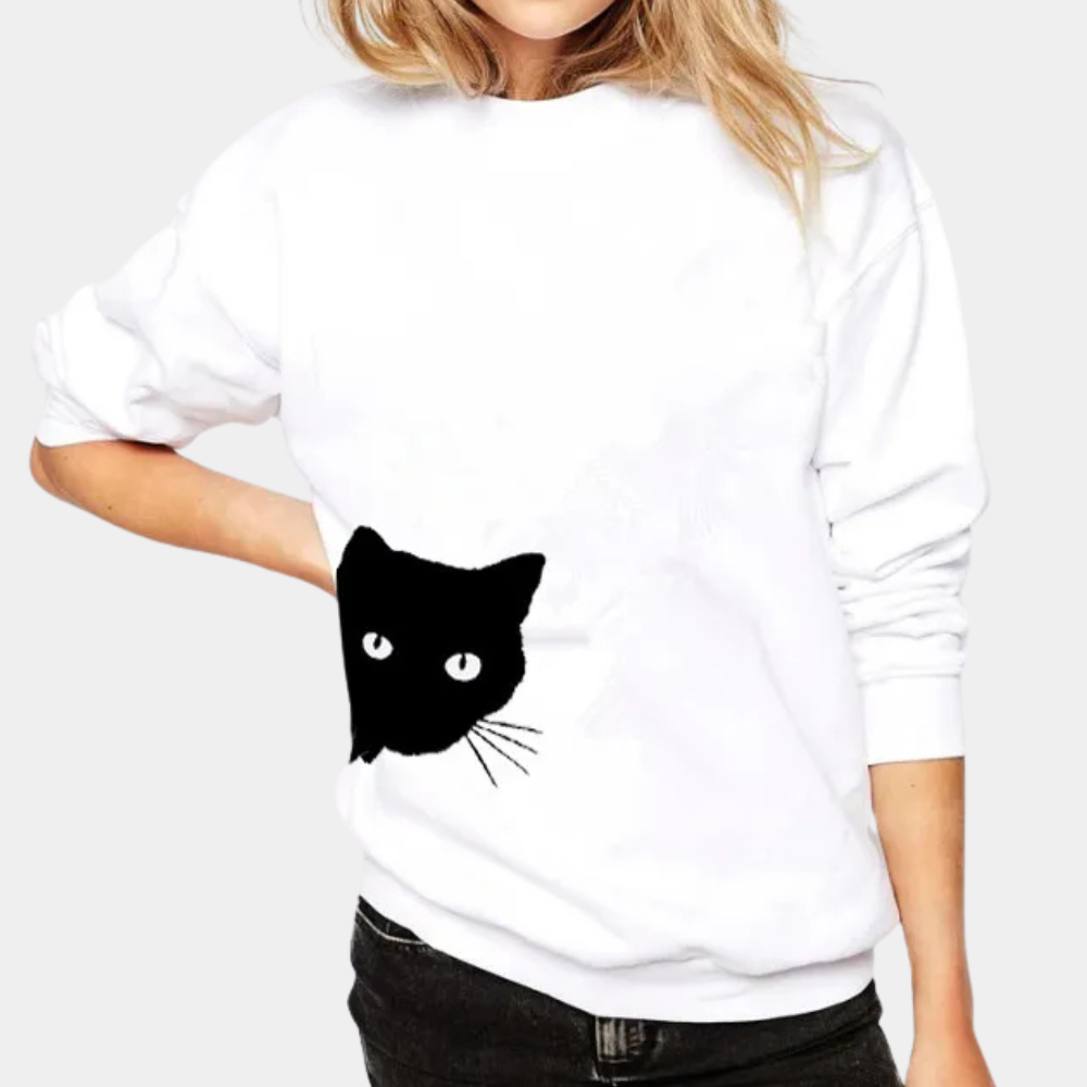 Questa felpa oversize con stampa di gatto che sbuca dal lato è perfetta per un look casual e originale.