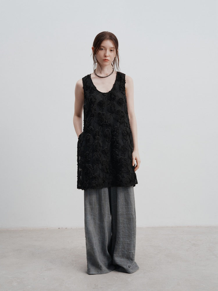 Questo gilet senza maniche conquista con la sua texture floreale in rilievo che dona profondità e interesse visivo. Il taglio dritto e oversize lo rende versatile e adatto a diversi tipi di fisicità, mentre le grandi tasche laterali aggiungono un tocco pratico e informale. Da indossare da solo come top lungo oppure sopra camicie o t-shirt per creare contrasti materici e volumetrici.
