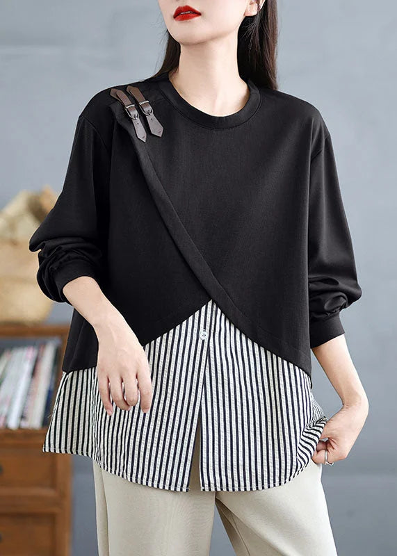 Questa maglia a strati con dettagli a righe unisce stile moderno e praticità.